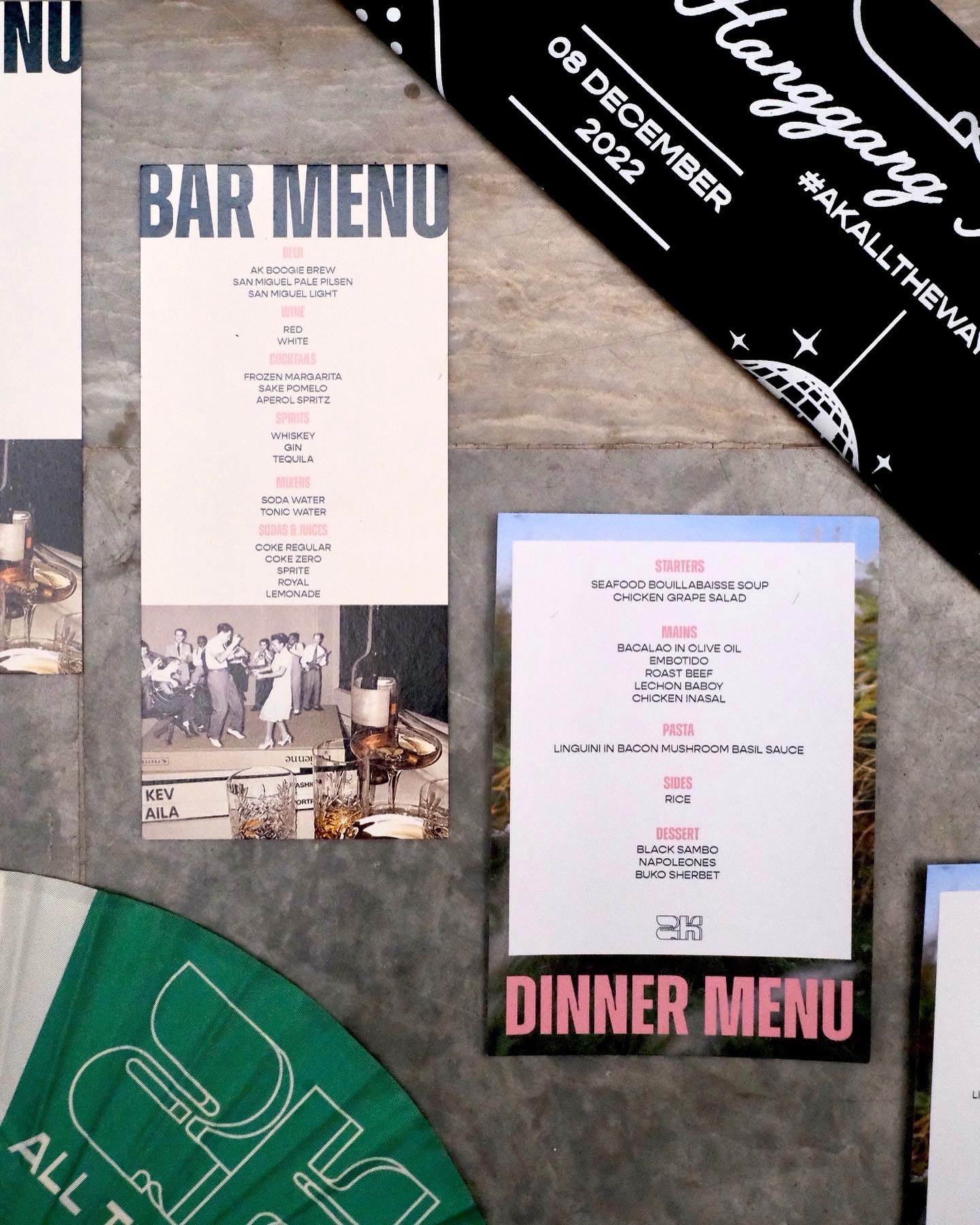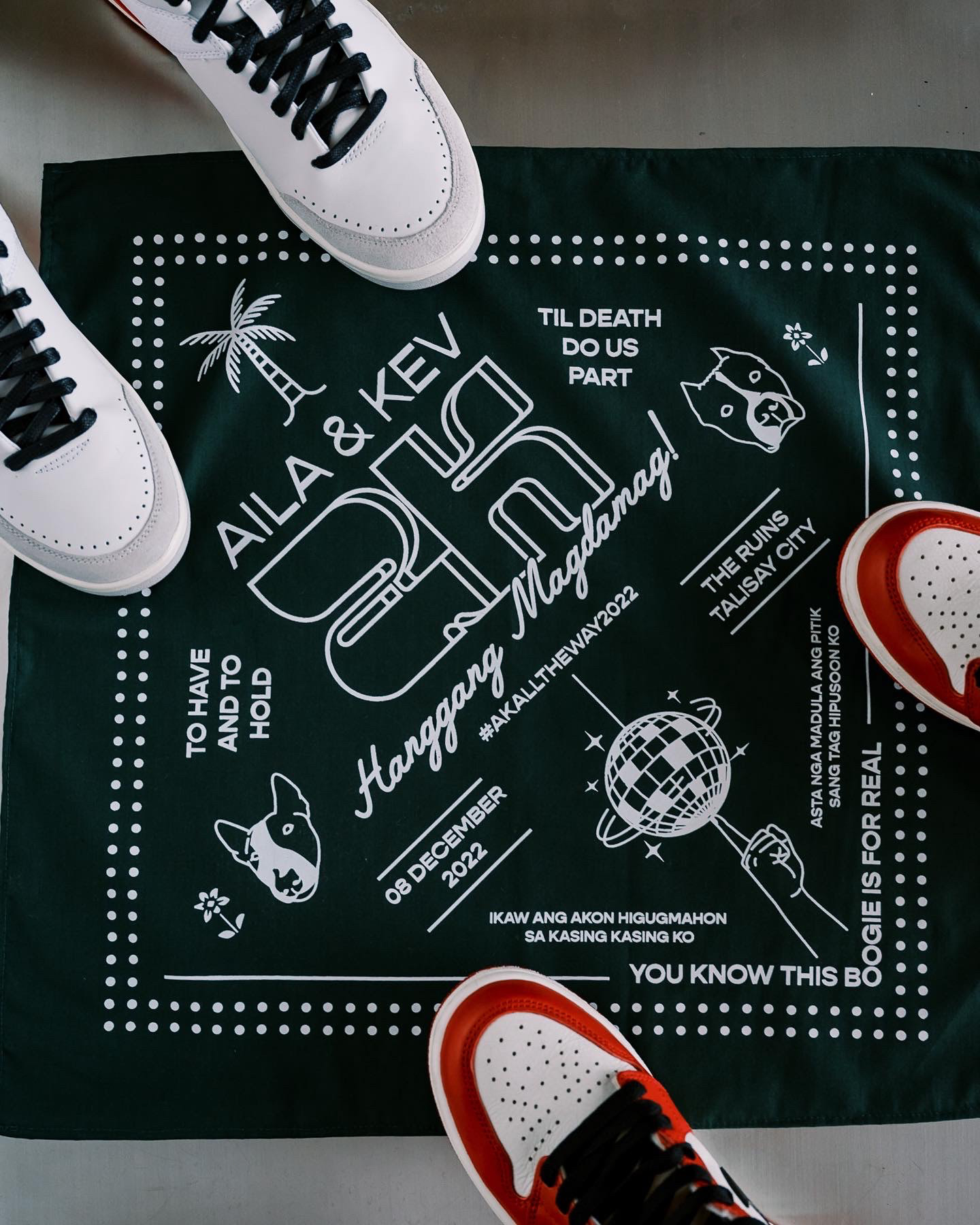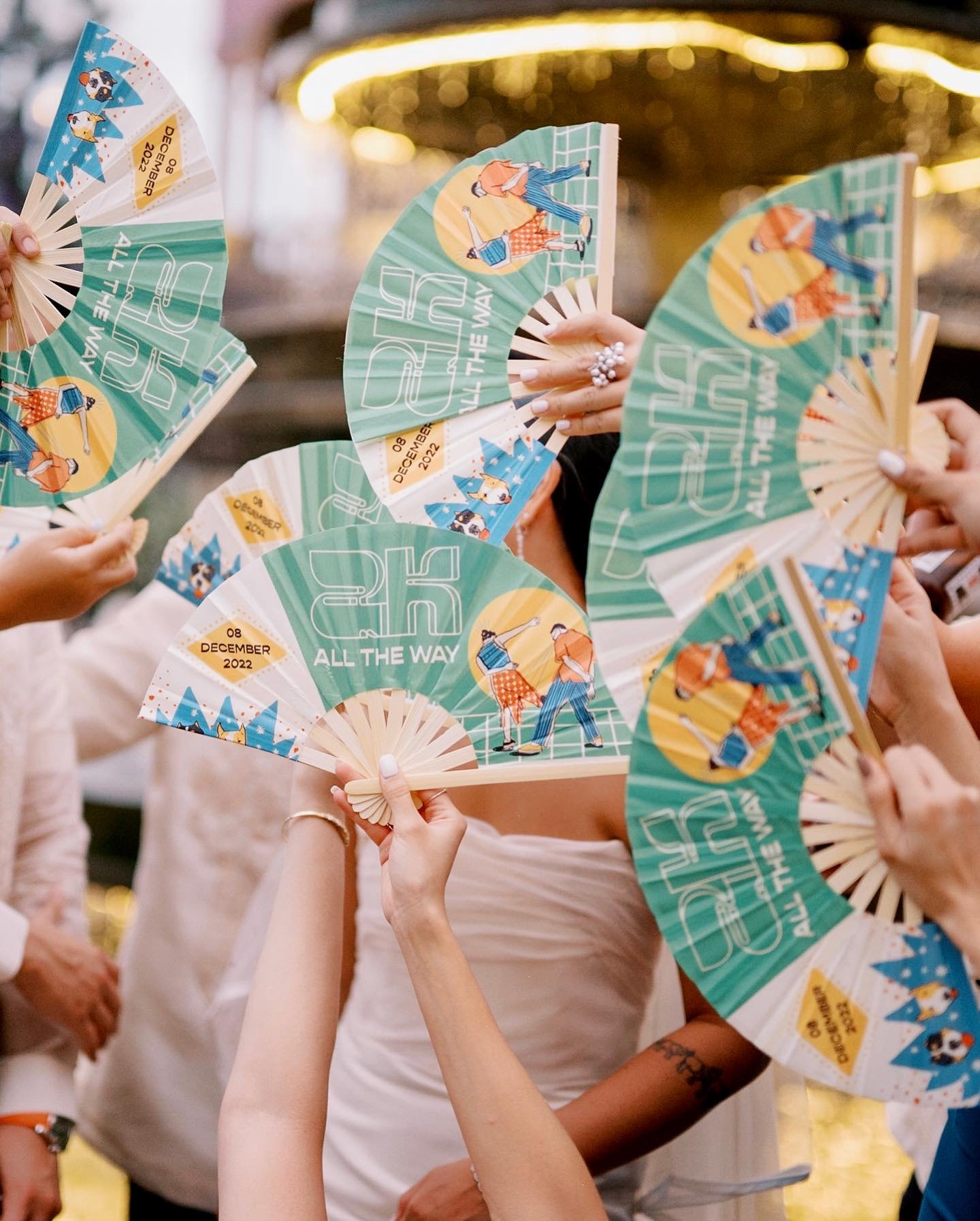 Working on the visual identity for my wedding was one of the most fun and challenging projects I’ve taken on. Kev and I wanted the wedding to reflect our personalities—simple yet vibrant, festive, and full of joy. It was a celebration not just of our journey together but of everyone who has been part of it. We aimed for an unconventional, colorful atmosphere centered around dinner, drinks, and dancing. We also gave away bandanas and fans as practical and fun souvenirs for our guests to use throughout the night.